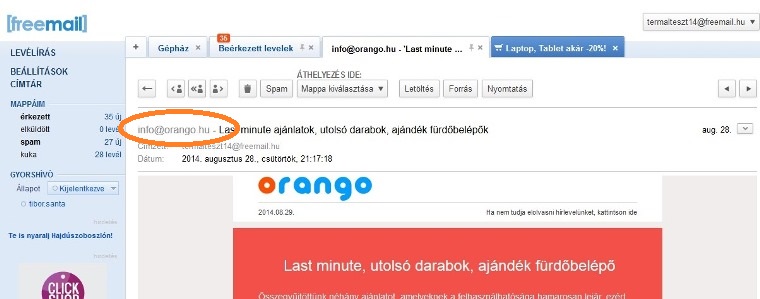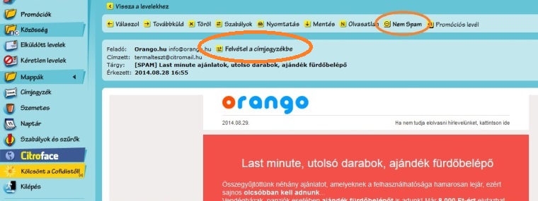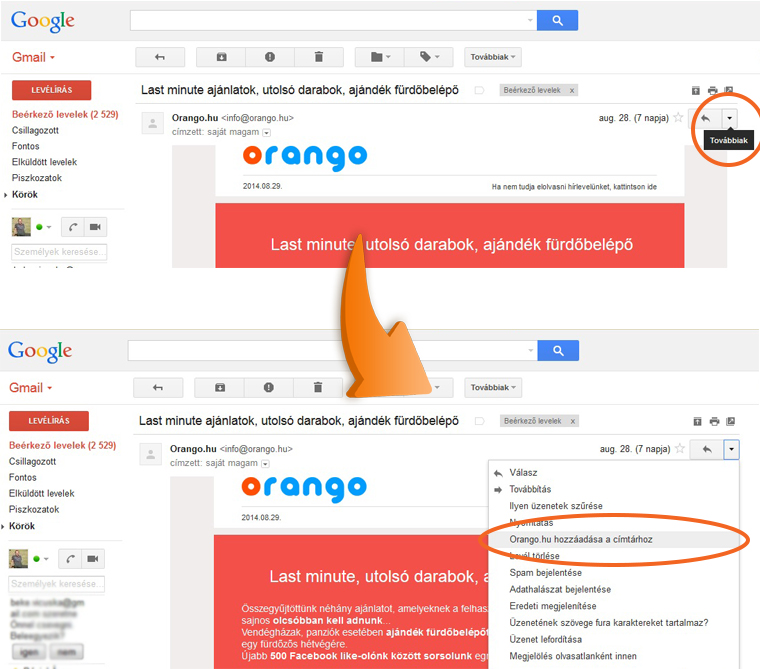 Az e-mail megnyitása után kattintson az e-mail fejlécében a feladó e-mail címére, jelen esetben az info@orango.hu-ra, majd válassza a Címtárba ment lehetőséget. Ha az e-mailt nem találja, akkor az valószínűleg a spam mappába érkezett. Ebben az esetben előbb kattintson a Nem spam feliratú gombra az e-mail fejléce fölött, majd utána mentse a címünket a címtárba az előbb leírt módon. A lenti képeken mutatjuk.
